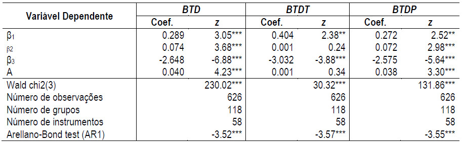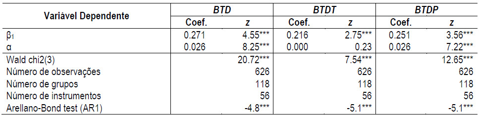 Os resultados dos testes da Equação 1 para os três tipos de BTD são ilustrados na Tabela 4. Para cada uma das estimações, os testes de Wald chi2 e de AR(1) foram significantes em nível de 1%, sugerindo adequação dos modelos. Os coeficientes β1 positivos e significantes no nível de 1% sugerem persistência dos três tipos de BTD. Wahab e Holland (2015) não encontraram persistência para a BTDT para uma amostra de países code law e common law. A persistência da BTDT, nesta pesquisa, sugere que esse tipo de BTD pode estar sendo direcionado, principalmente, pela suavização de resultados, conforme propuseram Wahab e Holland (2015).