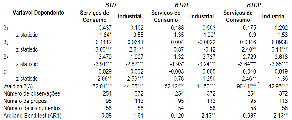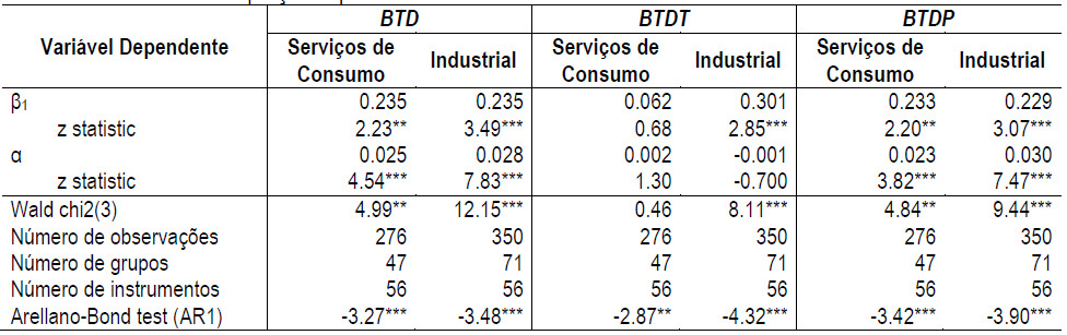 Na Tabela 6, é disponibilizada uma análise por setor, propiciando identificar persistência da BTD total e da BTD permanente nos dois setores analisados e persistência da BTD temporária apenas no setor Industrial. Wahab e Holland (2015) encontraram persistência da BTD nos setores Industrial e de Serviços de Consumo da BTDP apenas para o setor de Serviços de Consumo e da BTDT para o setor Industrial. Os resultados registrados na Tabela 4 demonstram, inicialmente, que os três tipos de BTD são persistentes para toda a amostra analisada. No entanto, ao se segregar a amostra, percebe-se que o grau de persistência varia por setor de atividade.