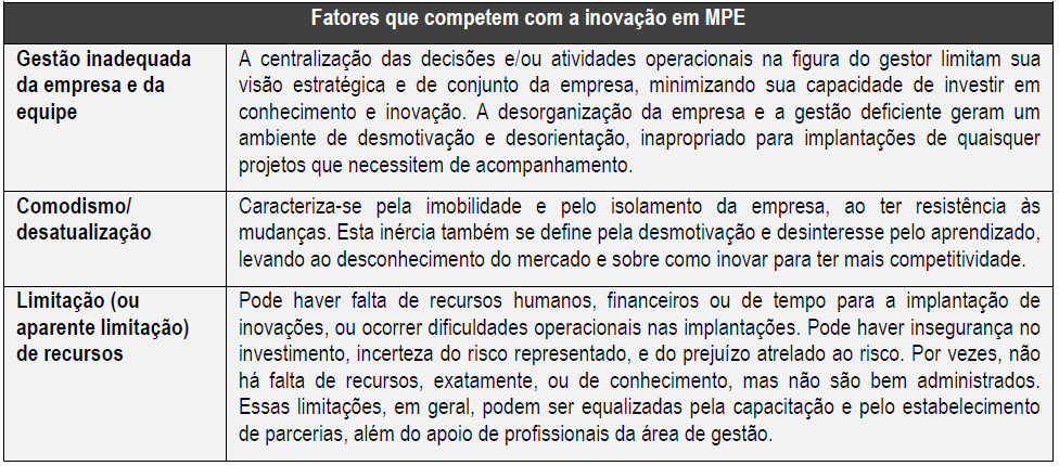 Também se considera que, nas MPE, o negócio e o empreendedor habitualmente se confundem. Com isso, as ações propostas para alavancar a inovação muitas vezes podem ser “compradas” ou “aceitas” pelos empresários. Então, ainda que a inovação seja em geral a origem das tendências, nas MPE deve-se fazer o contrário: essas “(...) empresas devem priorizar as inovações para se adequarem às tendências” (SEBRAE-PR, 2010, p. 147) sempre mutáveis. Desta maneira, as inovações frequentemente ainda são “vendidas” aos micro e pequenos empresários, em geral desprovidos de conhecimentos fundamentais sobre gestão e inovação, o que pode representar impeditivo para o sucesso da empresa.