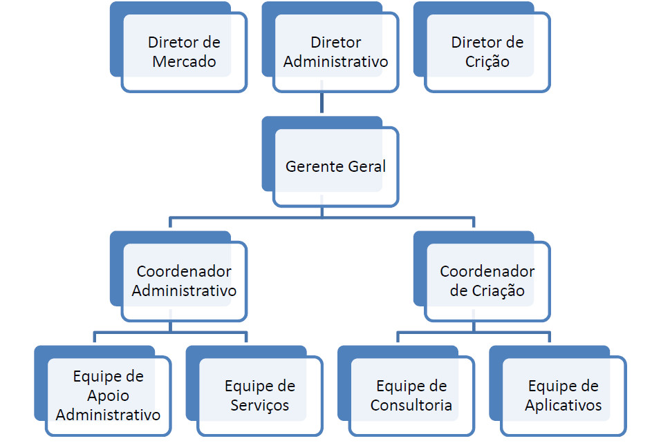 A QWE possui uma estrutura administrativa pequena. Com 39 funcionários, seu desenho organizacional é composto por três níveis hierárquicos (Veja figura no Anexo). O primeiro escalão é formado pelos três sócios, que dividiram a tarefa formalmente entre a Diretoria de Criação, a Diretoria de Mercado e a Diretoria Administrativa. A primeira cuida dos processos que envolvem o desenvolvimento de produtos e serviços disponibilizados. A segunda é responsável pelos contatos com o mercado de clientes, o que inclui prospecção e atendimento aos atuais. Por fim, a Diretoria Administrativa é responsável pela gestão de pessoal e o controle financeiro do negócio.