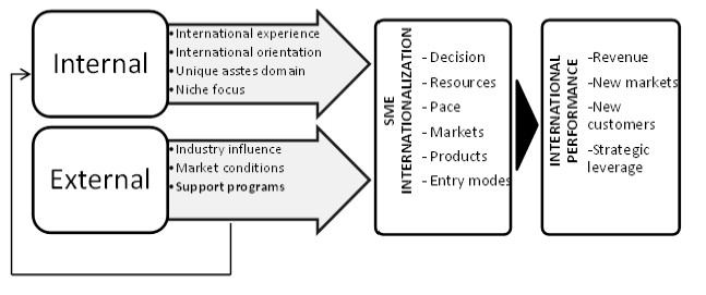 In the Figure 2 we propose a model, even still requiring of empirical validation, positioning the official support programs as an external factor in dialogue with internal factors of a BG firm. This consideration is expected to improve de international orientation and experience of SMEs managers and to produce reflexes in the SME’s internationalization process and performance.