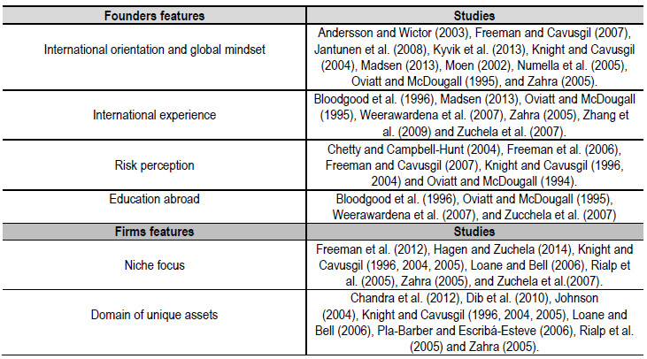 What is clear from the review of studies, trying to understand the internal factors of BG companies is the attention given by the researchers to characterize the entrepreneur who founded these companies (ASPELUND; MOEN, 2012; ZHANG et al., 2009). The characteristics of the founders of BG, stated in Table 1, can affect a greater or lesser degree of internationalization of a firm and its rhythm.