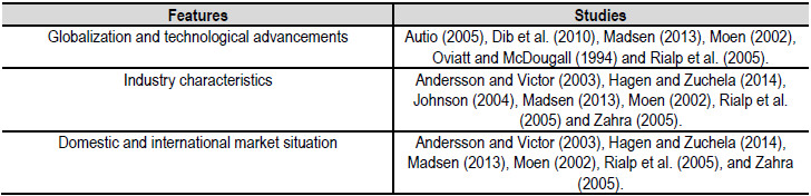 In general, the situation of the domestic and international markets and the floating exchange rate interfere in the decision by foreign markets. It is expected that an unfavorable situation in the domestic market stimulates SMEs firms to export (KNIGHT et al., 2004; MOEN, 2002).The Table 2 summarizes the main internal and external features related to the BG phenomenon.
