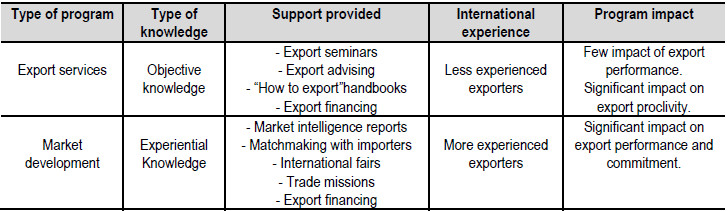 However, on the effectiveness of some export support programs, there is a causal model that emerges from the literature and links services that promote and support exports to the international performance of the companies that use them (FRANCIS; COLLINS-DODD, 2004; GILLESPIE; RIDDLE, 2004; LEONIDOU et al., 2011). Table 3 attempts to align the type of export programs with its impact on export firm behavior, according to the literature.