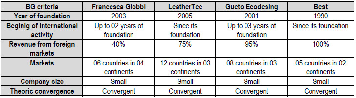 The cases selection was the critical phase of this study because they must represent cases where the theoretical interest would be more evident than in others, consistent with the recommendation of choice of the "extreme cases" (EISENHARDT, 1989). Therefore, we carried out an intensive research on the Brazilian shoe manufacturers associations to identify SMEs firms that met the criteria of a born global company. This task led us to the cases of Francesca Giobbi, LeatherTec, Gueto Ecodesign, and Best Footwear and Components. Eisenhardt (1989) recommends 4 to 12 cases to this type of research in order to avoid overload during the analysis.