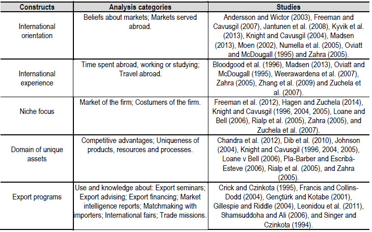 One of the key elements researched in accelerated internationalization, even considered an antecedent to this phenomenon, is the international orientation of the executives of these companies (KNIGHT, 1997; KNIGHT; CAVUSGIL, 1996, 2004; MOEN; SERVAIS, 2002; NUMMELA et al., 2004; ZAHRA, 2005). Knowledge and experience in foreign markets, which have been treated in many studies about BG as international entrepreneurial orientation, are significant antecedents of the performance and behavior of these SMEs in foreign markets (KNIGHT; CAVUSGIL, 2004, 2005; RIALP et al., 2005). Nummela et al. (2005) conducted an empirical test with 123 Finnish information technology companies which sought to identify the orientation for international growth. For the authors, the orientation of international growth becomes a precondition for a born global company, particularly in knowledge-intensive companies (ASPELUNDEN; MOEN, 2012; RIALP et al., 2005).