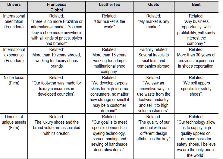 While some researchers believe that the BG phenomenon is the most common in high-tech sectors (CRICK; JONES, 2000; MADSEN, 2013), there is a belief that internationalized industries (AUTIO, 2005; DIB et al., 2010; MOEN, 2002) and in industries that compete for unique assets (OVIATT; MCDOUGALL, 1994) the emergence of the rapid internationalization of SMEs is more frequent. In general, this seems to be the case of the four SME firms studied. All are located in a footwear cluster in southern Brazil, where the leather-footwear industry has emerged for decades as one of the most export-oriented region (FORTE; MOREIRA, 2007).