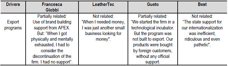 All the data obtained in the interviews and in the documents were analyzed using the technique of content analysis. The analysis categories were defined previously and were formed by two internal drivers related to the founders and two related to the firms. There was only one external driver investigated that was represented by the knowledge and use of export support programs (Table 5). This procedure allowed the data organization and analysis of the cases (KOLBE; BURNETT, 1991). After the content analysis, the second round of in-depth interviews with the four SMEs founders was conducted. The purpose here was to validate the findings of the first round of data collection and analysis.