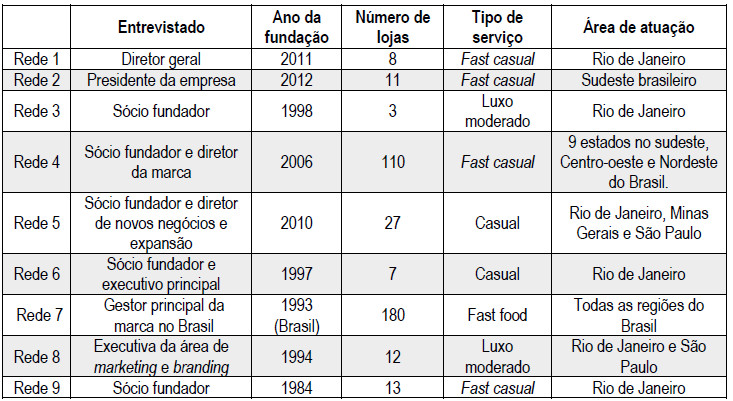 A seleção das redes ocorreu visando à representatividade das diferentes estratégias de expansão das redes. Assim, redes de diversos tamanhos, formas de expansão e tipos de serviço (fast food, fast casual, casual e luxo moderado) participaram da pesquisa. Além disso, foi considerado como critério de seleção o acesso e a disponibilidade dos gestores das redes. O contato inicial ocorreu por meio de mensagem eletrônica. As 40 redes elegíveis para a pesquisa foram abordadas por e-mail ou mensagem através do serviço de atendimento ao cliente disponível nos seus websites. Após este contato, as nove redes que concordaram em participar do estudo foram contatadas por telefone para o agendamento da entrevista. Os múltiplos casos participantes da pesquisa não foram escolhidos de forma aleatória, mas de acordo com a teoria, como recomenda Eisenhardt (1989). Sabe-se que vários casos dentro da mesma categoria levam à possível generalização analítica dos achados (Eisenhardt, 1989). Assim, a seleção buscou uma amostra composta de vários casos dentro de cada categoria. Seguindo a lógica da replicação nos estudos de casos múltiplos sugerida por Yin (2010), as empresas que participaram desta pesquisa possuem diferentes tamanhos, formas de expansão, tipo de serviço, áreas geográficas de atuação e tempo de funcionamento como descrito no Quadro 1.