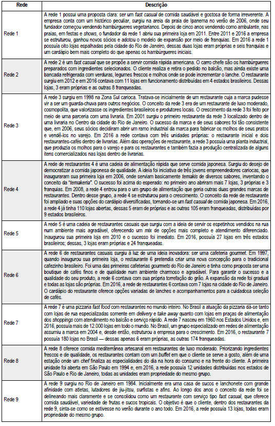 Após a leitura minuciosa e a seleção dos trechos de maior interesse para a pesquisa, cada uma das redes de restaurantes foi descrita tanto usando os dados coletados durante a entrevista quanto os dados externos públicos.
