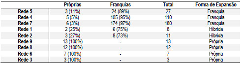 Inicialmente, apresentam-se as formas de expansão de cada rede e a análise de como essa estrutura influencia a gestão de padronização e inovação. Foram investigadas redes das diversas formas de expansão, mas não houve nenhuma rede puramente de franquias. As redes entrevistadas são todas de lojas próprias ou híbridas. Neste ponto foi necessário fazer uma escolha na pesquisa em relação a como categorizar as redes entrevistadas. Levou-se em consideração a maneira escolhida pela rede para dar prosseguimento à expansão e ao percentual de lojas próprias nas redes. Assim, redes com menos de 15% de lojas próprias no seu total de unidades abertas foram consideradas como franquias, pois essa foi a forma estratégica que a empresa escolheu para a expansão em larga escala. E, de acordo com esse critério, as cadeias estudadas podem ser rotuladas da seguinte maneira: as redes de restaurantes 4, 5 e 7 são franquias; os restaurantes 1 e 2 redes híbridas; e as redes 3, 6, 8 e 9 formadas por lojas próprias. A porcentagem e o valor absoluto de cada uma das modalidades de abertura de novas lojas em todas as redes entrevistadas podem ser conferidos na Tabela 1.