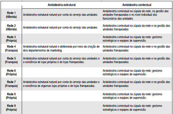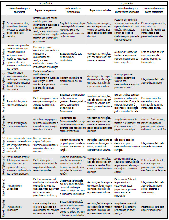 Assim, todas as redes entrevistadas mereceram análise em relação às atividades de exploration e exploitation. Além disso, traços de ambidestria tanto estrutural quanto contextual também aparecem destacados na análise. Nesse contexto, a forma de expansão das redes foi verificada como uma característica que pode tanto promover mais atividades vinculadas à padronização quanto à inovação ou mesmo equilibrar as duas capacidades resultando em uma estratégia ambidestra de forma estrutural. Também foram destacados todos os traços de ambidestria contextual que apareceram ao longo da análise.