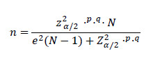 A população total desta pesquisa é composta por 923 indivíduos da Universidade Federal de Santa Maria, campus de Frederico Westphalen, distribuídos em seis cursos de graduação. Para o cálculo do tamanho mínimo da amostra, optou-se pela fórmula a seguir (Equação 1), que segundo Fonseca e Martins (1996), é para uma população finita. Considerou-se um nível de confiança de 95% e um erro padrão de 5%, a amostra mínima calculada foi de 272 indivíduos.