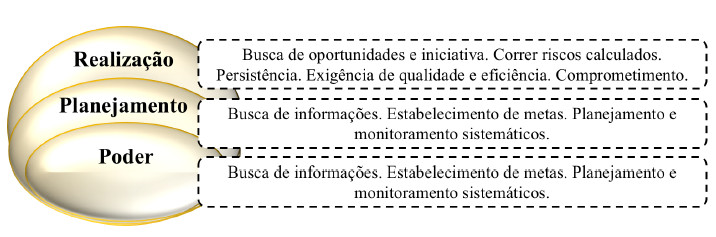 As características comportamentais empreendedoras foram reagrupadas em três categorias de competências pessoais diferentes: realização, planejamento e poder e referem-se às seguintes características: busca de oportunidades e iniciativa; persistência; comprometimento; exigência de qualidade e eficiência; correr riscos calculados; estabelecimento de metas; busca de informações; planejamento e monitoramento sistemáticos; persuasão e rede de contatos; e independência e autoconfiança (MSI, 1990). Sendo estas as características que o empreendedor bem-sucedido deve ter ou que precisa desenvolver.