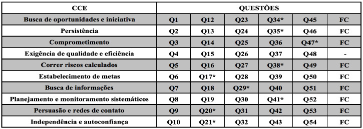 Fonte: Adaptada de Mansfield et al. (1987).O (*) da Figura 2 corresponde às questões negativas, cuja pontuação deve ser subtraída do resultado final da respectiva característica e se deve acrescentar 6 (seis) pontos ao final do somatório. As questões de número 11, 22, 33, 44 e 55 correspondem ao “Fator de Correção”, utilizado para evitar que, muitas vezes de modo inconsciente, o respondente apresente uma autoimagem excessivamente favorável. O Fator de Correção é utilizado se o somatório da pontuação dessas questões for igual ou superior a 20 (vinte) pontos. Se isso ocorrer, todas as CCE’s devem ser corrigidas com a subtração dos pontos correspondentes (Mansfield et al., 1987).