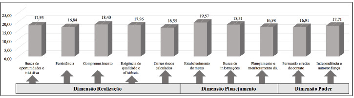 A partir da média, verifica-se que os discentes pesquisados possuem as características (³15,0), e que as mesmas estão na zona de 15,0 e 20,0 pontos.