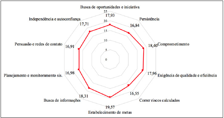 Ao considerar 25,00 como a pontuação máxima e 15,00 como a pontuação mínima para a presença das características (Mansfield et al., 1987), constata-se, por meio da média, que as características dos discentes pesquisados podem ser aprimoradas e desenvolvidas tendo em vista o limite máximo dessa pontuação. Para Minuzzi, Vargas e Fialho (2016), graduandos necessitam desenvolver as CCE’s para que possam competir no mercado, em que o principal desafio é a necessidade de profissionais flexíveis e adaptáveis ao ambiente de negócios.