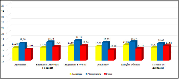 A dimensão Realização obteve a menor pontuação nos cursos de Engenharia Ambiental e Sanitária, Engenharia Florestal e Sistemas de Informação, enquanto a dimensão Poder consta com pontuação menor nos cursos de Agronomia, Jornalismo e Relações Públicas.
