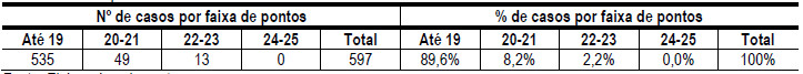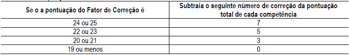 Na Tabela 1 consta o fator de correção para as CCE’s. A pontuação máxima é de 25 pontos para cada uma das características. Quando o total for igual ou superior a 15 pontos, o indivíduo possui a respectiva característica e é considerado empreendedor (Mansfield et al., 1987).