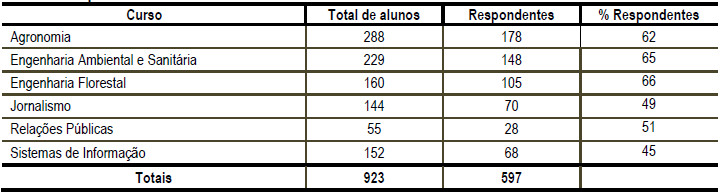 Da população de 923 alunos, foram obtidos 615 questionários nos seis cursos de graduação da UFSM-FW. Destes, foram desconsiderados 18 instrumentos respondidos de modo incompleto. O total e o percentual de respondentes são apresentados na Tabela 3.