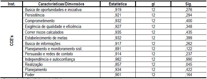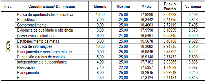 A partir do Tabela 4 é possível identificar as pontuações mínimas e máximas de cada característica e dimensão, assim como as médias, desvio padrão e variância. Para as características, o limite máximo é de 25 pontos, que não foi atingido nas características de persistência “24” e correr riscos calculados “24”. A maior média ocorre na característica correr riscos calculados “16,54” e a menor média ocorre na característica estabelecimento de metas “19,56”. O menor desvio padrão ocorre na dimensão realização das CCE’s, que contempla as cinco características iniciais e demonstra singularidade entre os resultados.