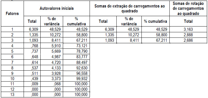 Na Tabela 6 consta a contribuição percentual dos fatores, a variância total, em que se percebe que três fatores representam 67,21% de contribuição.