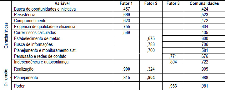 A partir da Tabela 7, verifica-se que os resultados coincidem com a classificação das características elaboradas por McClelland, em que a dimensão realização compreende as características de busca de oportunidades e iniciativa, persistência, comprometimento, exigência de qualidade e eficiência e correr riscos calculados; a dimensão planejamento compreende as características de estabelecimento de metas, busca de informações e planejamento e monitoramento sistemáticos; e a dimensão poder contempla as características de persuasão e redes de contato e independência e autoconfiança. Esse resultado confirma os fatores de cada dimensão do instrumento de características comportamentais empreendedoras (Mansfield et al., 1987). Para tal análise, não foi levado em consideração os valores das comunalidades.