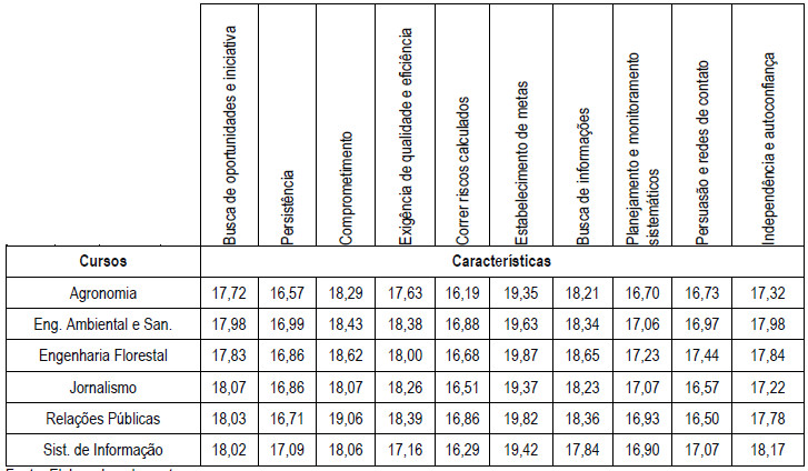 Constata-se que o curso de Agronomia obteve pontuações mais baixas em mais características, diante dos demais cursos, sendo quatro características: Busca de oportunidades e iniciativa “17,72”, Persistência “16,57”, Correr riscos calculados “16,19” e Planejamento e monitoramento sistemáticos “16,70”. O curso de Engenharia Florestal obteve pontuações mais altas em quatro características, diante dos demais cursos, sendo: Estabelecimento de metas “19,87”, Busca de informações “18,65”, Planejamento e monitoramento sistemáticos “17,23” e Persistência “17,44”.