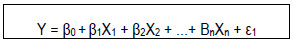Onde: Y é a variável de saída (dependente), β1 é o coeficiente do primeiro previsor (X1), β2 é o coeficiente do segundo previsor (X2), Βn é o coeficiente do n-ésimo previsor (Xn) e ε1 é a diferença entre o valor previsto e o observado de Y para o i-ésimo participante.