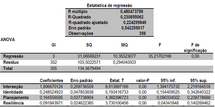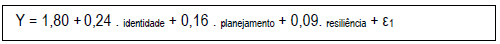 Sendo assim, observam-se na Tabela 03 os valores encontrados para os coeficientes, interseção (1,80), identidade (0,24), planejamento (0,16) e resiliência (0,09). Estes coeficientes, ao serem inseridos na equação da regressão, irão resultar em um valor (saída), que informará em que grau cada previsor afetará o Y (percepção de sucesso), se todos os demais previsores se mantiverem constantes. Configurando-se dessa forma: