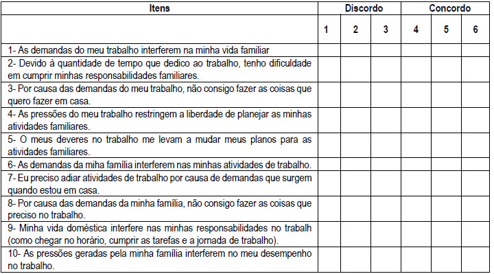 Como você avalia a relação entre a sua vida no trabalho e na família? Avalie, de acordo com a escala abaixo, cada um dos itens, que descrevem formas de como o seu trabalho interfere na sua vida familiar e vice-versa. Na coluna ao lado de cada item assinale seu nível de concordância com a ideia apresentada.