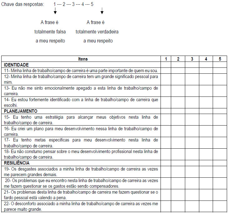 A seguir você encontrará uma série de frases que abordam aspectos da sua vida profissional. Você encontrará a expressão “linha de trabalho/campo de carreira”, essa expressão refere-se à área profissional em que você está situado ou se dedica atualmente. Use a chave de respostas abaixo para informar o seu grau de concordância com o significado da frase, marcando ao lado da frase o número correspondente a sua resposta.