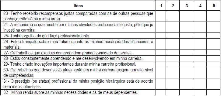 A seguir estão listados várias frases com percepções que você pode terem relação a sua carreira, seu trabalho e sua vida pessoal ligada ao trabalho. Para cada item, você deve escolher um grau entre 1 e 5 conforme você discorda totalmente (1) ou concorda totalmente (5).