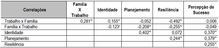 Quanto às correlações positivas, serão analisadas as que se mostram com maior força para o contexto da pesquisa, são elas: Identidade e Planejamento (0,402), no constructo do comprometimento com a carreira, Identidade e Percepção de Sucesso (0,370) e Planejamento e Percepção de Sucesso (0,379).