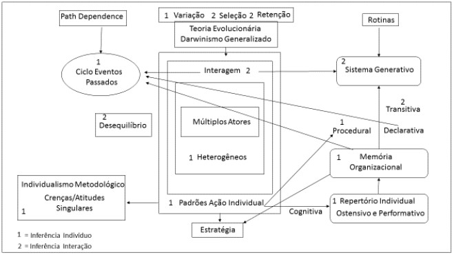 A teoria evolucionária a partir do darwinismo generalizado parte do pressuposto de que múltiplos atores heterogêneos interagem na organização em um ambiente em desequilíbrio. Assim, tem-se os padrões de ação individual. As inferências, representadas pelo número 1, podem ser identificadas a partir dos padrões de ação individual (1), que apresenta similaridade com atores heterogêneos (1).