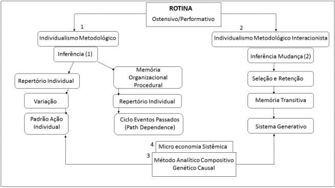Na Figura 2, apresenta-se o framework conceitual para o estudo das rotinas organizacionais a partir dos aspectos ostensivo e performativo, tomando por base os elementos de inferência individual do individualismo metodológico (1) e da inferência interação (2) representada pelo individualismo metodológico interacionista (2).