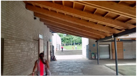 No dia seguinte, logo cedo, Godofredo foi de metrô até sua primeira reunião. Catalina Velez, gestora do Parque Biblioteca Belém (Figura 2), o receberia para uma entrevista e visita guiada ao equipamento. Como chegou com quase uma hora de antecedência, teve tempo suficiente para observar o movimento do lugar. A primeira surpresa: nada de detectores de metais ou revista. O prédio ocupava todo um quarteirão, atravessando de uma rua a outra sem portões ou grades (Figura 3).