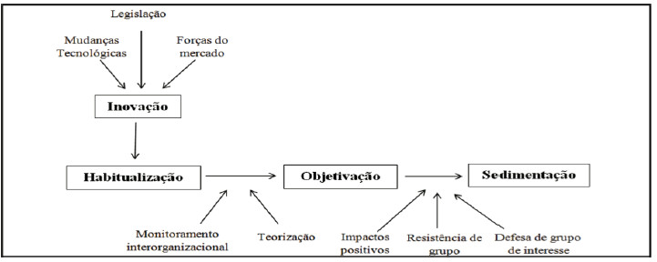 Assim, a partir de estudos anteriores, Tolbert e Zucker (1999) desenvolvem um modelo do processo de institucionalização, conforme Figura 1, composto de três processos sequenciais: