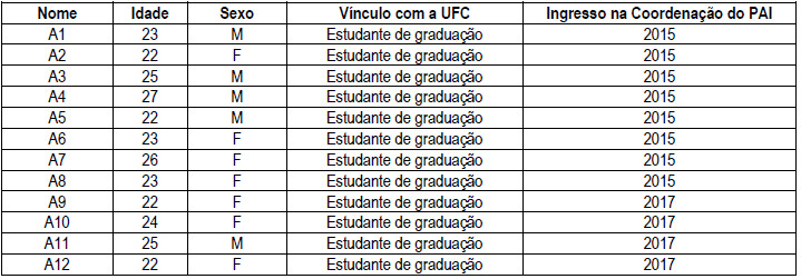 Os sujeitos da pesquisa foram escolhidos de forma não aleatória, considerando os critérios de relevância e acessibilidade. A escolha desses estudantes deve-se ao conhecimento sobre as atividades padronizadas e não padronizadas do PAI, já que atuaram como gestores dos processos do programa por um ano, como mostrado na Figura 2. Foram excluídas as pessoas que não dominavam os processos do PAI, pois não seria possível visualizar a evolução ou não do programa ao longo dos anos com a visão de um participante que não conhece todo o processo.