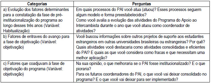 Tal fenômeno foi analisado com base em entrevistas com questões abertas correspondendo ao objetivo do presente artigo, fundamentado no processo de institucionalização de Tolbert e Zucker (1999), entrevistas estas realizadas com os doze estudantes que atuaram como coordenadores do PAI nos anos de 2015-2017. Para Manzini (1990), a entrevista semiestruturada está focalizada em um assunto sobre o qual se confeccionou um roteiro com perguntas principais, complementadas por outras questões inerentes às circunstâncias momentâneas à entrevista. Para o autor, esse tipo de entrevista pode fazer emergir informações de forma mais livre e as respostas não estão condicionadas a uma padronização de alternativas. Ressalta-se que o instrumento de pesquisa foi validado com três ex-coordenadores do PAI e, após as devidas considerações do mesmo, as entrevistas foram descartadas como um pré-teste.