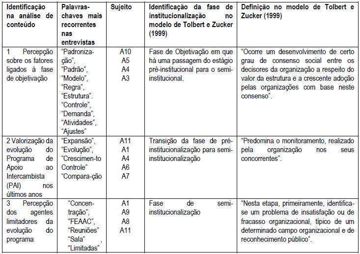 Tolbert e Zucker (1999) definem objetivação ou semi-institucionalização como a fase que envolve o desenvolvimento de um consenso entre os adotantes a respeito do valor da estrutura, além da sua adoção crescente com base nesse consenso que emerge por meio de dois mecanismos: o monitoramento, realizado pela organização nos seus concorrentes, o qual avalia os riscos de adoção de uma nova estrutura; a teorização, que atribui à estrutura uma legitimidade cognitiva e normativa geral. Diante disso, destaca-se a seguinte colocação de um dos atuais coordenadores do PAI (A11):