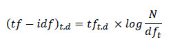 Assim, o índice mais utilizado é o TF-IDF (Equação 01). O índice TF-IDF considera uma composição da frequência do termo (TF) com o inverso da frequência dos documentos que possuem o termo (IDF). Dessa forma, é possível valorizar termos raros, que diferenciam os documentos, e que, quando ocorrem, possuem uma frequência significativa perante os demais. Além disso, este índice desvaloriza termos que ocorrem em muitos documentos, penalizando-os inclusive com o valor 0 quando ocorrem virtualmente em todos os documentos (Altszyler et al., 2017;Crain et al., 2012).