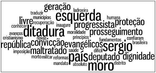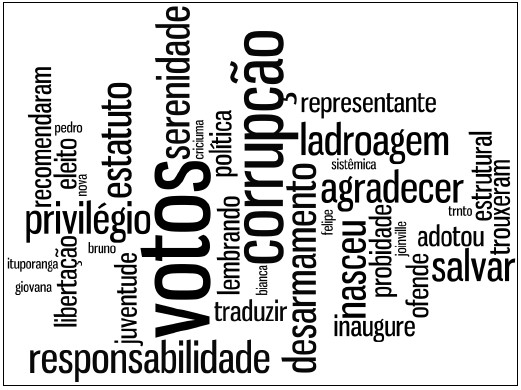 Por fim, o tópico três (Figura 9) apresentou uma diversidade maior de termos, que compuseram 65% da explicação total, sendo 50 termos, contra a média de 25 termos dos tópicos anteriores. Este tópico apresenta os termos “votos” e “corrupção” com maior representação dentre as demais palavras. Um aspecto interessante foi que esse tópico reuniu a maior quantidade de nomes de cidade (como “Criciúma” e “Joinville”), bem como diversos nomes próprios (“Pedro”, “Bianca”, “Bruno”, entre outros), indicando que neste conjunto de discursos houve diversas menções nominais.