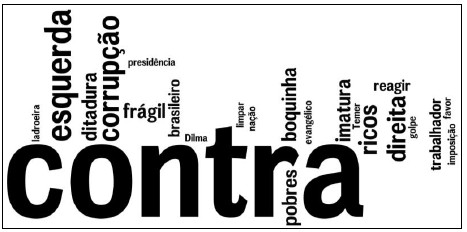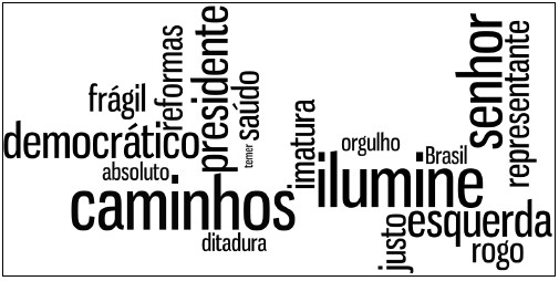 Movimento semelhante pode ser percebido no segundo bloco do Quadro 3, que apresenta as palavras exclusivas dos votos contrários à abertura do processo de impeachment. Nota-se que os termos “cunha”, “eduardo”, “michel” e “temer” fazem alusão a figuras políticas da época, e que têm um peso significativo com argumento dos votos “não”. Ainda, expressões como “golpe”, “trabalhadores” e “luta” parecem caracterizar mais um posicionamento político do que uma avaliação sobre o tema em questão. A seguir, destacam-se dois trechos que ilustram esse ideia: