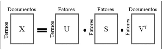 Assim, o resultado após a criação do espaço latente foram as três matrizes, U, S e VT (Equação 02). Estas representam, de forma aproximada, a matriz X original, de termos e documentos, ponderadas pelo índice TF-IDF. A matriz U contém, nas linhas, os termos resultantes após todos os procedimentos aqui descritos, e nas colunas, os fatores associados a cada termo. A matriz S contém os valores singulares na diagonal e zeros. Já a matriz VT, por fim, contém os documentos nas linhas e os fatores nas colunas já no seu formato transposto. Os valores dos fatores são os responsáveis por conectar os termos com os documentos, por conterem os autovetores, à esquerda e à direita, da matriz X.