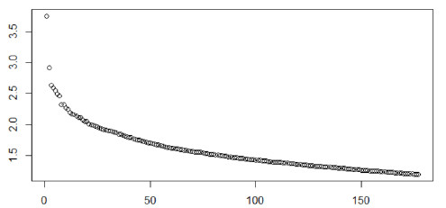Seguindo a documentação da biblioteca LSA (Wild, 2015), foi definido o cálculo da decomposição em relação à retenção dos valores singulares (ou seja, as raízes dos autovalores), objetivando a redução de dimensionalidade dado o LSA. O parâmetro, chamado dimcalc, permite definir como serão escolhidos os valores singulares a serem retidos. A definição da quantidade de valores singulares retidos para posterior análise é um problema em aberto na literatura (Efron, 2007; Ashton et al., 2014), portanto para definição da retenção foram testados alguns dos parâmetros disponíveis. A escolha foi por permanecer com a definição do parâmetro que trouxe os autovalores correspondentes à melhor relação custo-benefício, uma vez que a adição de novos autovalores (e por consequência novos vetores no espaço semântico) acabava por agregar marginalmente, em relação ao custo de inclusão de uma nova dimensão. A Figura 3 apresenta a relação gráfica dos valores singulares, demonstrando a participação marginal daqueles na ponta da cauda.