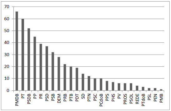 Para melhor leitura dos dados, apresentam-se aqui alguns dados quantitativos importantes em relação à estrutura política que derivou o corpus de documentos trabalhados. Primeiro, a Figura 4 apresenta a distribuição de partidos em relação aos presentes – ou seja, aqueles cujo discurso está contido nos dados analisados. Percebe-se que o partido com maior quantidade de representantes foi o PMDB (66 votantes presentes), seguido pelo PT (60 votantes presentes).