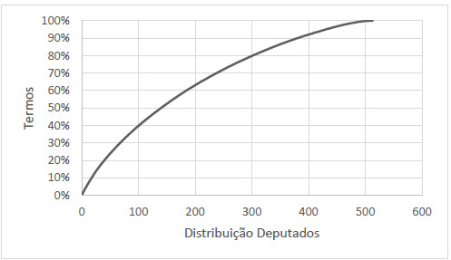 Após o pré-processamento descrito na seção anterior, o total de palavras na base, considerando repetições, foi de 131.410 termos. O discurso mais longo consistiu de 894 palavras, o que representa menos de 1% do total da base. Ainda assim, a parcela de 80% dos termos foi fruto do discurso de 300 deputados, o que representa que grande parte das palavras foi dita por mais da metade dos presentes. Percebe-se assim que, apesar das diferenças no tamanho de cada um dos discursos, o corpus utilizado é consistente com a lei de Zipf (Zipf, 1949), que atesta que se utiliza um pequeno conjunto de palavras para expressar a maioria das ideias, independente do idioma. A Figura 5 apresenta a distribuição dos termos em relação à quantidade de deputados.