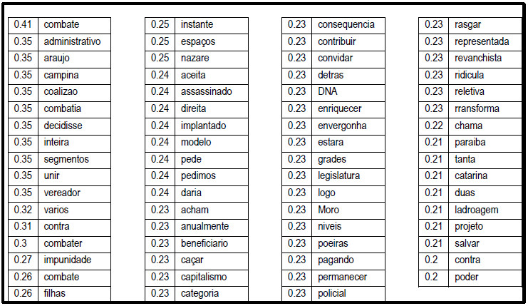 Dado a pauta em questão quando da votação, uma primeira exploração dos dados foi em relação aos termos mais fortemente associados com a palavra “corrupção”, por meio de uma análise de correlação diretamente na matriz de termos e documentos. A medida de correlação identifica a força da relação linear entre os termos, variando de 0 a 1 (Hair et al., 2010). A Figura 6 apresenta as palavras cujo índice de correlação com o termo corrupção era maior ou igual a 0,2, em ordem decrescente. Alguns termos representam uma aversão, relatada no discurso, à corrupção, como “combate”, “contra” e “caçar”. Outras significam repúdio, como “ridícula” e “envergonha”. Há ainda termos interessantes, como “ladroagem”, “DNA” e “revanchista”.