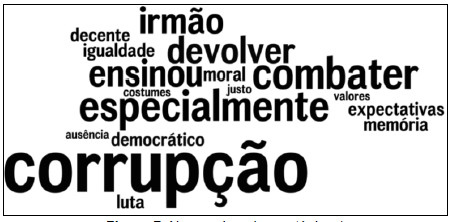 A primeira nuvem, apresentada na Figura 7, traz o tópico cuja maior carga é o próprio termo “corrupção”, responsável sozinho por aproximadamente 10% de representatividade nesta dimensão, dentre todos os 3.353 termos únicos. Percebe-se que as palavras “combater” e “ensinou” apresentam respectivamente os maiores índices. Há também algumas expressões curiosas, como “irmão” e memória”.